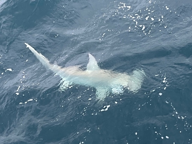 Deep-sea fishing in Fort Lauderdale for sharks can be very productive, depending on the conditions. The current was slowly moving to the North and we had a light easterly wind. Kyle set out dead and live baits in a staggered spread from the deepest bait up the spectrum to the shallowest bait. The moment came quickly—a powerful strike that nearly pulled the rod from its holder. John took the challenge, his muscles straining as he battled whatever was on the other end. The struggle was intense, the fish diving deep, testing his endurance. But he held on, reeling it in inch by inch, until finally, the beast broke the surface—a massive Hammerhead Shark.