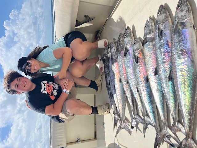 As the sun reached its zenith, casting golden rays across the water, Captain Dave decided it was time to try something special. They moved to deeper waters, where the big fish lurked. Danielle, John and the boys had an extremely active trip with hooking Kings and a Mahi Mahi. I wanted them to experience the thrill of a big one. With heavy rods and stronger lines, the crew set the dead bait, hoping for a monster. We use Penn and Shimmano 80's which are big game tackle.