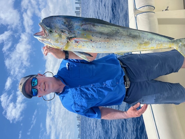 As I was trolling the reef off in the distance, there was a frigate bird working a school of flying fish. This typically presents a great opportunity to find what is chasing the baits. We approached the school of bait, and as soon as we made a pass, the rigger line came down, and we had a big Mahi Mahi on. John reeled this nice one in smooth and kept the fish from jumping off the hook, soon as within gaff range, Kyle reached out and gaffed the Mahi Mahi.