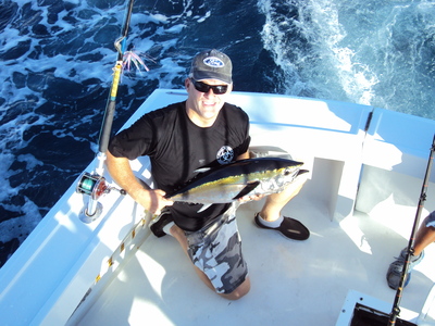 With blue water pushing in, it was time to set up the kite. As I crossed over the color change, the other plainer went down. As the line exited the reel at a high rate of speed, I knew it would be a good fish. Twenty minutes later, Dave, our mate, leaned over the side and gaffed a 24 lb. Black Fin Tuna.