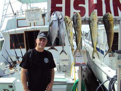 Then we went into kite fishing. We put out two kites and two live Goggles Eyes from each kite. Our first fish was on the left long kite as Claus reeled in a Black Tip Shark, which was brought to the side of the boat for picture taking and release. We reset the kite, and wound up catching four gaffers Mahi Mahi's.