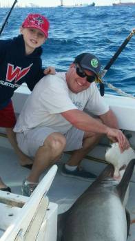 The anglers decided to do some Shark fishing, so we went out to 350 ft. of water north of Fort Lauderdale. We put out three Shark baits, one on the surface, one midrange and one bottom bait, and a kite with two live Goggle Eyes. After a forty-five minute wait, the bottom bait rod bent over with 15 minutes left as line screamed off of the 80 International Penn Reel. Adam and son was our angler, and he hopped into the fighting chair to do battle with the Shark. After a thirty-five minute battle, a Golden Hammerhead Shark broke the surface – estimated weight to be 190 lbs. Dave, our mate, wired the Hammerhead Shark to the boat, while pictures were taken. The Shark was released to fight again. with smiles on both father and son face.