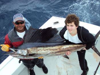 There was a slight color change starting to form with a rip on it south of Fort Lauderdale in 195 ft. of water. This was the place to put out the kites and do some live bait fishing. We put two kites out with two live Goggle Eyes from each kite and one from the rigger. We told fish war stories, especially about their Great Grandfather, Charles, and what a fantastic angler he was. With fifteen minutes left in the charter, the black shadow appeared on the short right kite bait. This Sailfish was not aggressive at all. Immediately I yelled down to Dave, our mate, to splash the bait on the surface to entice the Sailfish to feed. The Sailfish made the mistake – he ate the bait and the fun started – hooked up!!!! Jackson was the angler and jumped into the fighting chair. The Sailfish came out of the water showing his pure energy and exposing his bright neon colors from the reflection of the sun. What a show!!!! Twenty minutes later, our mate, Dave, grabbed the leader, pictures were taken of the Sailfish, hook was removed, and the Sailfish swam away to do battle again.