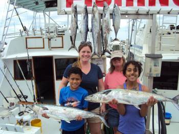 Fifteen minutes after leaving the Bahia Mar marina lines were in 120 ft. of water at the sea buoy in Fort Lauderdale, 1.8 miles from shore. We started off trolling with two plainers down and three surface baits. I worked the reefs ranging from 75 ft. out to 190 ft. of water, zig zagging in and out over the reefs. Our first fish was a Bonito that Roman brought in followed by a Kingfish brought in by Ava. From there the two took turns reeling in the fish, totaling one Bonito and 6 Kingfish while Janis was the official photograph and Jill was the cheerleader!!! The last fish that was brought in was a good size Kingfish weighing 14 lbs, which Ava and Roman took turns reeling it in.