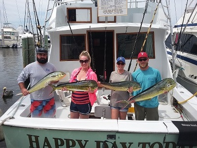 With Captain Nate at the helm, we stopped to purchase a dozen live Goggle Eyes from T&T Bait located in the inlet in Fort Lauderdale. We went immediately into kite fishing in 150 ft. of water south of Fort Lauderdale, Florida, where a color change was forming from a clean green to an indigo blue, a perfect avenue for any predator to travel down. Our first strike was a swing and a miss – a Kingfish skyrocketing out of the water cutting the live Goggle Eye in half. After resetting, a Sailfish appeared on the right short – very lethargically and not interested in the bait. Dave, our mate, pulled the bait up and down to make the bait fish splash in the water and entice the Sailfish. But to no avail – the Sailfish just swam away. That Sailfish was just not hungry!!! Our next fish was a Mahi Mahi as Amanda brought in her first Mahi Mahi – her five month's pregnancy did not stop her from succeeding in bringing in her fish. We reset in the same color change area and this time three more Mahi Mahi's appeared – a triple header as the rest of the anglers reeled in their Mahi Mahi's. Dave, our mate, did an excellent job untangling the lines to catch all three Mahi Mahi's.
