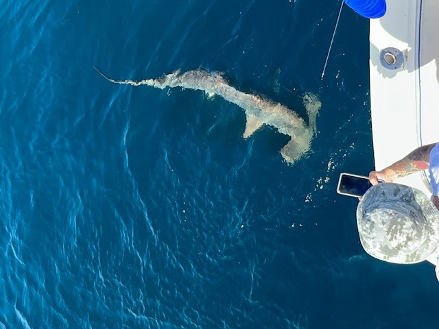 So next we decided to head back inshore, set up in 350 feet of water and try for a Shark. The first mate rigged up two of the fresh Bonitas with circle hooks. He cut the baits from the tail towards the head removing the tail, which we call a butterfly bait. He also set out two kites, one to the right and one to the left. Kite fishing is a good presentation displaying the baits on the surface. We fished three live baits and one Shark bait from the two kites. The first mate also sent down the butterfly Bonita 325 feet towards the bottom of the reef. This style of fishing is exciting for all customers because you can see the live bait swimming around, and a lot of times, you can see the dorsal of the Sailfish and/or Shark swimming up to the bait. Also, with this style of fishing, we are constantly maintaining the live baits to keep them on the surface, not too deep, and of course, not out of the water. The best position is a foot below the water line splashing and making a commotion. Suddenly, the line started ripping off the Shark reel, and we had a nice one on. One of the anglers got in the fighting chair, hooked himself into the harness and started fighting the fish. This fish was ripping off drag, diving down deep again and again. The angler was doing his best to retrieve the line, lifting the rod up and cranking on the way down, gaining as much line as he could - this continued for 45 minutes. He did a great job bringing the fish up closer and closer to the boat. Then we could see “color”, which is the fish coming up from the depths of the ocean. When the fish got close enough, the first mate removed the 2-pound lead and started wiring the fish towards the boat. We ended up catching a very nice Hammerhead Shark. We took a couple of nice pictures and safely released the Hammerhead Shark.