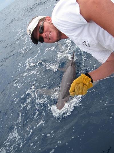 Daytime swordfishing was next on the list. On the first drop the rod bent over. Captain Paul yelled down to Darin, the mate, "hit the button!" Electric reels are a beautiful thing when the bait is down 1800 feet. No swordfish for the FF II, it was a 14 foot Thresher shark. We still wanted to catch a sword so we made our second drop, waited about 20 minutes and the rod bent over. We couldn't believe our eyes, it was an 11 foot Thresher shark. Thresher sharks are a very rare catch and two back to back is even more unbelieveable. That's the beauty of deep sea sportfishing, you never know what your going to land offshore fishing in Fort Lauderdale.