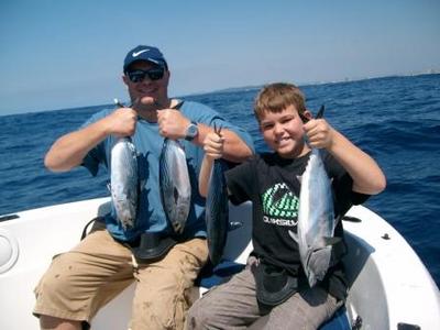 I decided to go out deeper and so we went to around 80-90m (263-296ft) depth and trolled over the old wrecks still with the light tackle, although the wind had settled down nicely I noticed a complete absence of birds. We then started getting Eastern Little Tuna all in the 2-2.5Kg (4.4-5.5lb) weight and even got 1 double hook up. Mostly we were just getting 1 at a time; these fish are great fun and give a good fight on light tackle. We also saw some Whales swimming out there and a Logger Head Turtle.