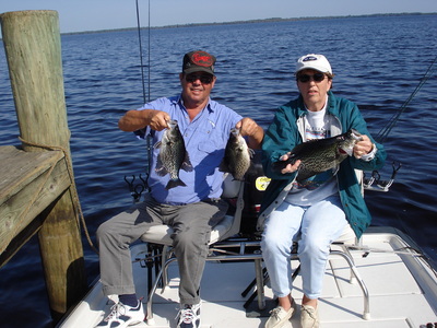 Well we went to Lake Monroe today regardless what the weather forcasters said for most of the time they are wrong.We started out on Lake Monroe long line pulling and were catching fish until it just got too rough so we went north up into the St Johns river between markers 110 and 114 and continued to pull Culprit and AWD crappie baits. The bite was good and we caught a limit of fish before the boat traffic got to bad.The secret today was to pull at 1.2 mile per hour in 13 feet of water, the fish seemed to be suspoended at about 4-5 feet