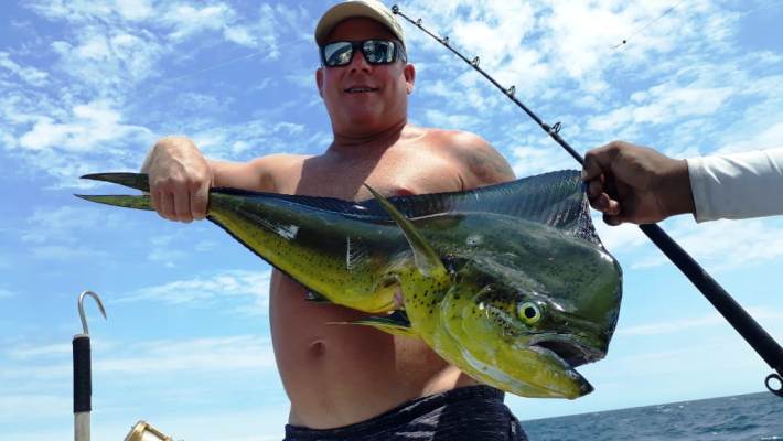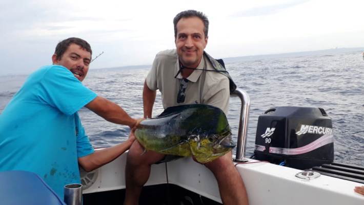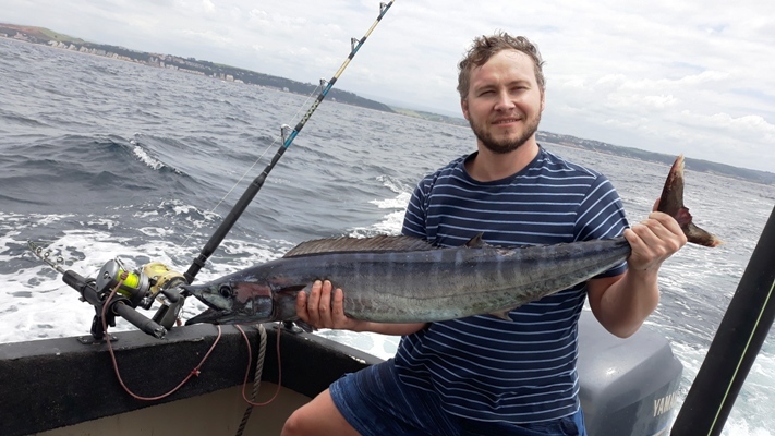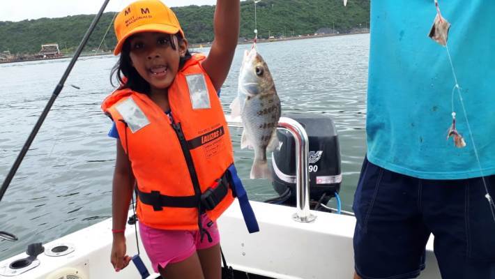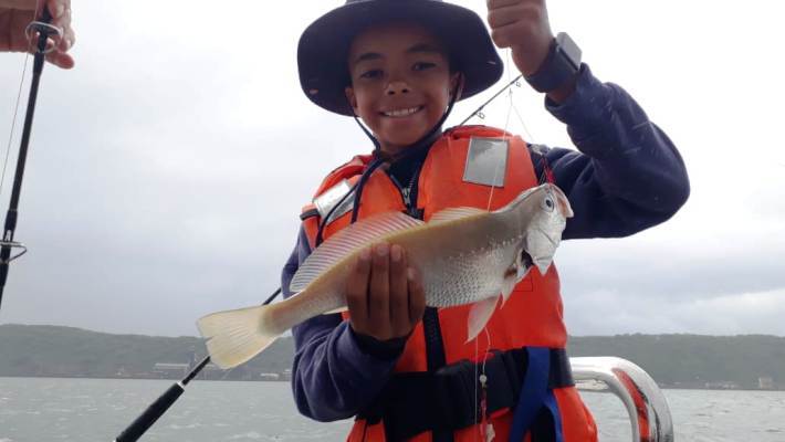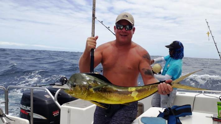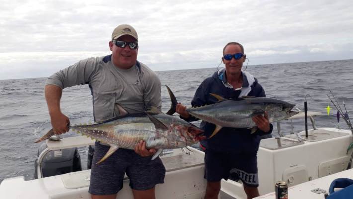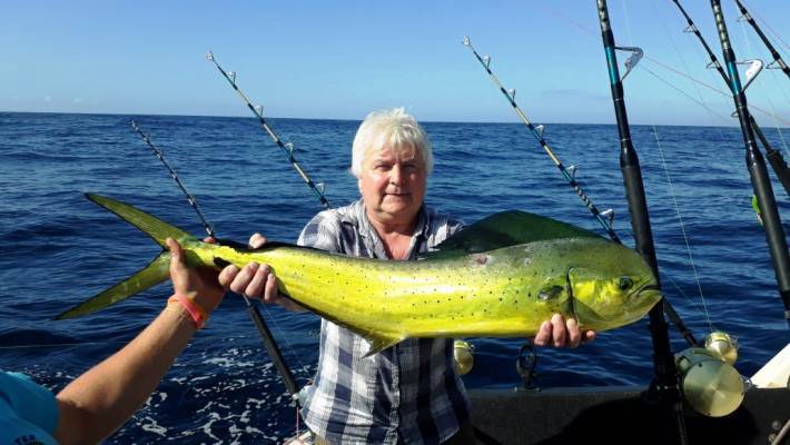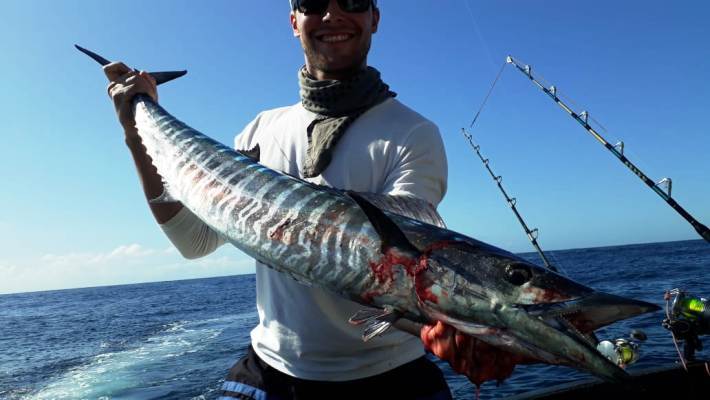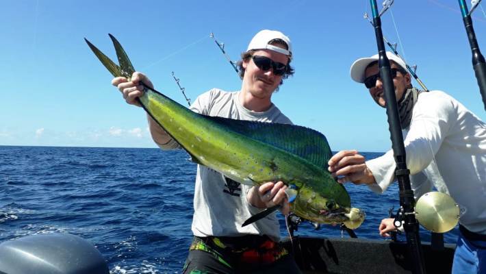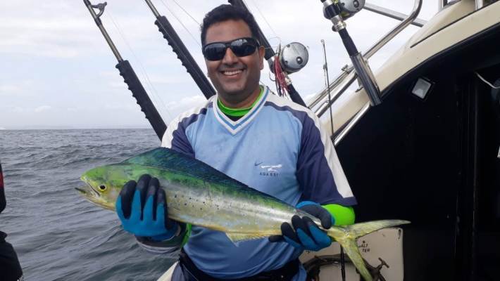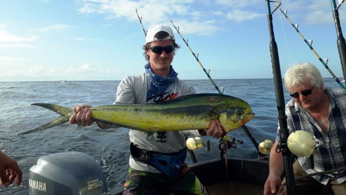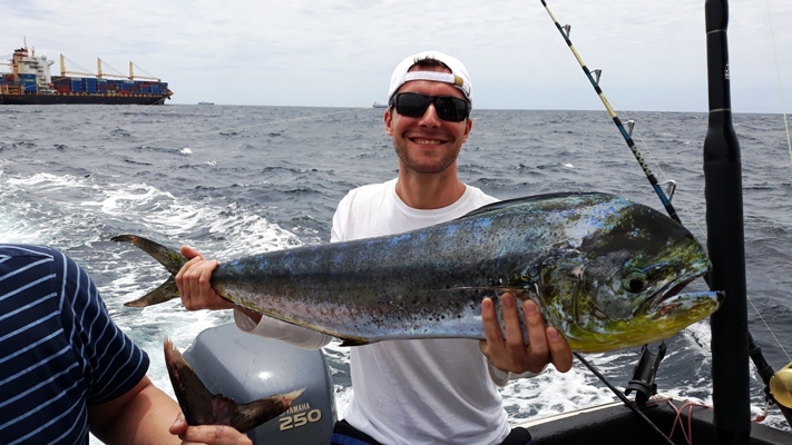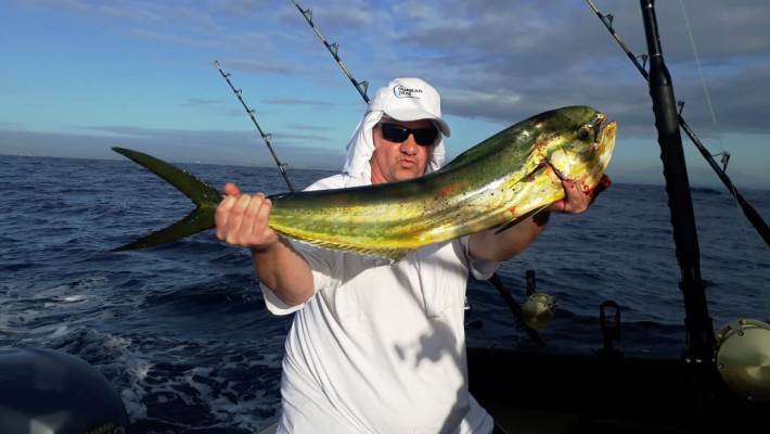 Since we got our Marlin the last 2 weeks of fishing has been very difficult and we have been busy with a lot of trips on all boats, water temperatures went almost up to 30 deg.C and I have never see water this warm straight out the harbour, in the harbour exceeded 32 deg.C. Strong NE winds and SW busters made for some rough seas on occasion and many days had both, one morning we were about to launch at 04h30 when a 38knot SW wind came through and we finally only launched at 11h00. After all the warm water things cooled down to big varieties of water temps from 22deg.C right up to 27deg.C in close proximity sadly the water has gone green, I hope this last SW has cleared this up. So with calms seas on occasion or during the day and some rocking and rolling, rain and many other challenges with guests from Czech Republic, Australia, UK, USA, Germany and good old SA we managed to get some fish but not as many as we wanted. Wahoo have now made their appearance, Dorado are still a regular catch and they are getting bigger now, we chuck the small ones back so they can grow, Tuna have been scarce but the ones we do get are quality sizes, Bonito have been few and far between and we have seen Marlin jumping and had them in the spread but no strikes, Dolphins have been regular visitors out in the deep. We saw something really incredible that I have never witnessed off Durban on our way back in a strong west from far North, we came across a shoal of over 200 GT’s from 30-50Kg, they were not scared of the boat but no matter what we offered them they would not bite, observing their behaviour it looked like they were spawning. We had some kiddies trips in the harbour and the fish were biting in the warm water so actually much easier than fishing offshore. With Marlin and Wahoo around I think we will see some nice catches coming up in the next 3 months.