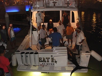 ok...how big "700-800 lb" was the answer I got from crewman Ricardo Agundez...so now it was a question of if they could make it back in time, before the 9.00 pm deadline. They were off of San Jose, the wind had come up a bit and they had a full load aboard of anglers, crew and now after much effort, a large fish. The boat began racing back to Cabo in the evening darkness, over a 1000 people eagerly awaited at the marina, and Wayne Bisbee was on the dock with his stopwatch....we willed them to go faster and imagined that we would see their lights at any second, but it was not to be...the 9.00 pm deadline came and the fish was automatically disqualifed. The boat came into view at nine minutes after nine to everybody's dismay....well except the team that was now in first place....and all could see that this was easily the largest fish of the day.