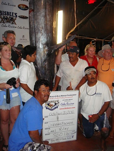 The 30th year of the Bisbee Black & Blue Jackpot Tournament got underway Wedenesday with 103 teams lining up off of Land's End for the traditional shotgun start, full of expectation and hope, especially as a lot of big fish have been taken lately. It was early afternoon when the first qualifying fish was back at the scale, a 371 lb blue for lady angler Andrea Fletcher followed by a 431 lb black marlin caught by Ron Pasco, aboard Karma, who went into the lead, not to last though, as other boats started to show up with fish. Not long after the 5.00 pm lines out signal, Reelaxe showed up with a very nice 599 lb black marlin putting them into first place, however not many people had noticed that "Great Escape" a 48 ft Cabo, which charters through Pisces had hooked up a little afer 3.00 pm, was still working away at a large fish.The group aboard came from Houston and it was their first foray into the Bisbee Tournament. They had hooked a stiped marlin a little after 1.00 pm which got off pretty quickly but trolled on towards Gordo Banks. About two miles south of the Gordo they were dragging lures, including one favorite of deckhand Manuel, which he had brought from Los Barriles the day before, when a giant marlin came up behind the boat and snatched the lure..being trolled from a 130 Penn International rigged with 100 lb line. Angler Carl Riley was in the chair and set to work on taming the large blue. The fish never jumped and after about a hour they realized it was dead. Now the work began for angler Carl who had to pump up the deadweight of a very large marlin, completely unassisted. The clock ticked on and still the exhausted Carl forced his screaming muscles to keep going...finally after five hours they had the fish at the boat and the ordeal began of trying to get it on board. I spoke to the crew on the phone and was told "it's a really big fish"