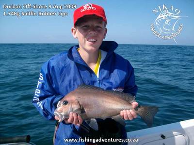 We then went out to the reefs and fished bottom with bass tackle, and this proved to be the answer as we immediately started out with a double hook up of 2 very large bridle trigger fish, we caught Natal stumpy, slinger, many more triggers and a few other species aswell as a very nice sized Englishman. The highlight was a 1.74Kg threadfin rubberlips (a first for my boat) which gave a superb fight and took a lot of line, and the boy had had a really great day.