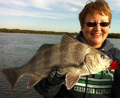 Jean and Jim came on another mixed bag backcountry fishing trip with me, after having a great time last year on a mixed trip with me during their vacation, it was one of the cold mornings driving the fish down into the deep holes, fishing live shrimp, catching school trout, sheepshead, snappers, and the top fish of our trip a beautiful Black Drum caught by Jean................