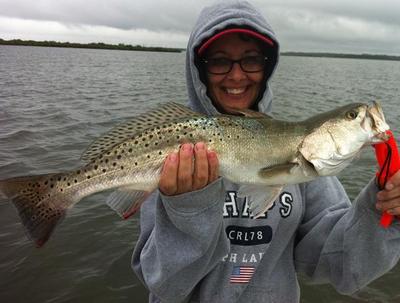 Early winter patterns have arrived to Mosquito Lagoon Florida with an early chilly spell in mid November dropping water temperatures into the upper 50's during the cold days, now hovering in the low 60's as air temps are nice and mild with highs some days at 75 to 80'F. The colder water has Redfish starting to school on the flats with winter sight fishing patterns as water gets much clearer as the temp drops. Seatrout are also a winter target species on the lagoon waters, the larger Trout frequent the flats along with Redfish, while most school size Trout are caught along the drop offs edges of holes and sloughs in the backcountry. Jig type artificial lures are good for these deeper water fish, while I use mainly select size live shrimp and small live finger mullet for shallow water Reds and Trout this time of year. Repeat clients from Daytona, mom Kate, dad Fred, and daughter Calle, recently had a great trip with me on the flats, it was a breezy, rainy, chilly morning, but the fish were happy to be biting, we caught 7 Reds up to 29" and 7 Trout, including 5 in the slot, Kate here with her 24" speck as she was the Trout Whisperer this morning........................
