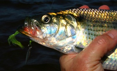 I staked out the boat for a few minutes and when I did a school of fish swam right up to us. Dave hooked and caught one on a four inch DOA CAL jerk bait (http://www.doalures.com/cal_tails.htm). Those two we boated (and released), both slot fish, would be it for the day.