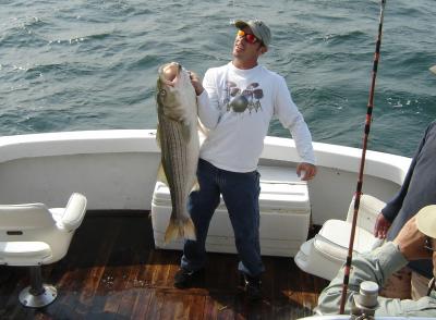 Well, by the end of the first two hours we had landed six nice bass and a few big bluefish. Krissy stated she always lands the largest fish when she and Lance go fishing. This was Lances day. He hooked up on a striper that was ounces away from 40 lbs.. Krissy did land a good size bass but this was her husbands day to out fish her. Lance won the $20 bet they had. What he doesn't realize is he'll never see that $20. I'm married too, I know how it works. They all did win one thing. Mother Nature gave them a good day of fishing on Billingsgate Shoals in Cape Cod Bay.