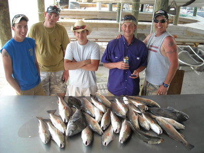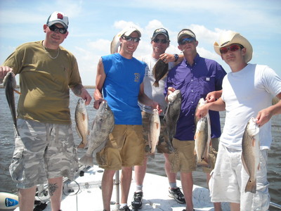 Had a crew of Acadian Paramedics Brady, Ben, Derek, Cane and Scott from Marksville La down on the bayou this past weekend for some fishing fun and RR. The weather was perfect light winds and warm temps and a rising tide. The guy's wanted redfish so that is what we went after. Worked around the marsh picking reds at most spots with some redfish going in the cooler Most fish between 16" and 20" and the small ones back overboard. The rods were bent and that was the important thing steady action all day and a great group of guy's. We cut up and laughed joked with each other all day. These guy's really enjoyed the day and had a blast. They booked another day in August to do it all again.
