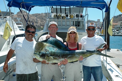 OTHER SPECIES: Dorado catches were number one for us this week with fifty four percent of our boats catching between one to twenty four fish. On the 24th the boats found a ton of Dorado at 10 miles out from Golden Gate. Father and son, Christopher and Louis Tudico from Erie, PA released eighteen dorado and kept six between 20 to 45 lbs; all caught with caballito live bait aboard "Andrea". This same day, celebrating their 25th wedding anniversary, Kevin and Wendy Otten from Albuquerque, New Mexico boated twelve dorado between 20 to 45 lbs at the same spot. On the 25th Sean Heyes and family from Durban, South Africa went out on "Bill Collector" and caught eight dorado, releasing five small ones and keeping three between 30 to 40 lbs for dinner. Dean Heyes also caught a pilot shark and a 25 lb jack crevalle. Heather and Matthew Adamson from Midlothian, Texas did a good job aboard "Ruthless" boating four dorados between 20 to 35 lbs and 35 lbs wahoo caught with green/yellow and tigrillo lures on the 26th.