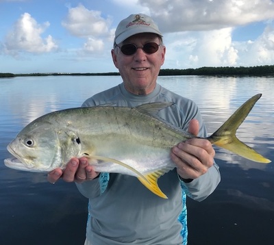 We are already getting east breezes off the ocean early in Autumn 2018, this starts the process of clearing the water in the Indian River and Mosquito Lagoon Backcountry after a long Florida summer with the usual cloudy warm water. Easterly winds push in more clear ocean water at nearby Ponce Inlet on each incoming tide which filters through the intracoastal waterway resulting in clearing water through the fall. The fall mullet and baitfish run is going strong this year with a flood of finger mullet schools moving south through the area with game fish in tow feeding on the bait fish, schools of good size Jack Crevalle, Bluefish, Ladyfish and Spanish Mackerel to name some, also Tarpon of varying sizes from 10 to 20 lb. teenagers up to 50 plus lb. adults are also in with the baitfish schools. The Jacks and Blues frequently are surface attacking mullet in the morning as they push mullet up to the surface and strike in white water splashes making for great sight catching, a bait or lure cast in the action is usually a sure thing, multiple hook ups are common with these schooling Jack attacks, Wayne from Ohio caught some this way, lots of fun on light tackle…………………..