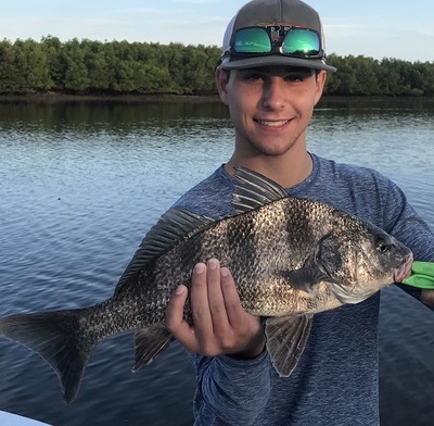 Black Drum have been a regular catch here all year in the backcountry, catching them on shrimp, sizes from pretty little ones of 1 lb. up to nice drag pulling 5 lb. fish which are a good battle on my light tackle outfits, Timothy from Georgia with a nice one………………..