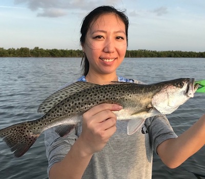 Seatrout are also a year round, almost every trip target species, they school up more in the cool months and are more scattered in the warm months, we catch smaller school size specks on shrimp and small lures, larger ones usually on live bait fish and larger lures, Stephanie from Orlando with a nice Mosquito Lagoon Trout………….