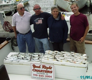 Had a 1/2 day trip today with Jean Church and Chris Wright of Midway, NC alongside his dad, Gene Wright from Quinwood, WV. We left the dock in search of any fish that would bite! First stop was on the Blues and quickly the crew landed about a dozen or so and then as soon as the tide went "slack" they quit biting.