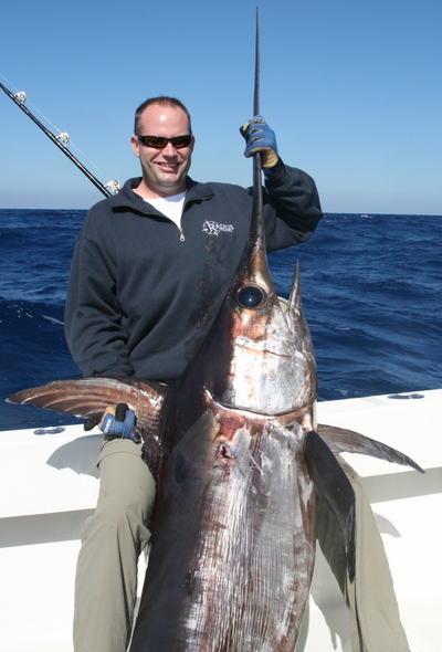 We are now well into the fall and the species we are targeting are swordfish, sailfish and wahoo. Luckily all three of these species have cooperated. The past few days have been a swordfish mini marathon fishing a few swordfish day trips as well as a swordfish combo trip. Luckily the bite was decent and we did get a fish on these trips. The first day I fished with a good client and friend, Stephen, and some friends that he brought along with him. We did a day sword trip and the weather was perfect. We made two drops without a bite and on our third drop we hooked a nice fish. Stephen and company did a great job with the fish hand cranking it up from 1800 feet of water for the majority of the fight. It was definitely a decent fish with an overall length of 122 inches. That's over 10 feet of pure muscle and brawn. We did two more drops and on our last drop hooked another "donkey" but unfortunately pulled it off half way up. The next day we had a new clients who booked a combo trip from noon to midnight for both day and night swords. After a few drops with no bites we finally hooked a fish and all four clients got a crack at it. With an 85 pound fish in the box, everyone was breathing a bit easier. We set up for the night drift and although we never got a bite at night, we had absolutely great weather and everyone had a great time. They are already planning to come back to get another crack at it and are even planning a sailfish trip as well. The third sword trip was a day trip with repeat clients who had sailfished with me before but had never caught a sword. Well it was quite the interesting day. We made 7 drops that day and hooked and fought 6 swordfish. We finally got one all the way to the leader and within 30 feet only to watch it swim away. It was a legal release, and although not a huge fish, it was intended for dinner. The guys I had were all college students and they hand cranked every single fish from beginning to end. With 6 fish on in one day, that's a lot of hand cranking and my hats off to them for never giving up.