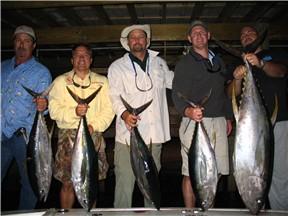 .....Friday was the legal counsel trip from Leake-Anderson in New Olreans..Another fun day..good weather and crew two days in a row..Had Dean, Stan, Lou and John from Iowa..the action was fast and furious for these young lawyers..we had 15 tuna bites in 3 hours putting 13 yellowfins in the box..we then pulled a while for wahoo then ended the day looking for cobia..found a school of 10 twenty pounders hooking one but losing him to the rig..got home early..Bill had Ted Farmer and crew and ran the seas..they covered some ground today and found a limit fo aj's and 2 nice yellowfins..they lost 2 monsters on mullet..Saturday should have been a weather day but two boats went for it..Scott L had Scott Gautier and Bill had the Francetic family..three guys on each boat..they came in with one yellowfin for each guy, the largets 90 pounds..The Scott's did some deep dropping and landed 3 snowy groupers to go withthier 3 tuna..wind would blow Sunday leaving Monday for us...I had just two guys on the boat that day; Aaron Burris and John from Jersey..we headed out east and found good water about 12 miles out..pretty quick bite today as both of our first two baits were snapped up by school fish seconds after deployment and our guys went to work..action was fast for the next two hours and the schoolies were fatter than normal and about 6 inches longer than previous trips..guess they are growing..avg size was 25-30 pounds and 44"..no real big ones today though we actually thought they these were bigeye tuna..lots of fun on light tackle and they cool quickly making for some increadible sashimi or poki..my kids and I have been tearing them up in the last 2 weeks..Had planned to do alot of running since conditions were nice for it, but there really wasnt any reason to leave these fish and it really didnt take long to make our anglers tired; Capt Scott Leger even reeled in some sushi fish..we kept 9 and tagged and released another 7 before noon..we even deployed the kite for the last three, just to make it sporting..you know you are having a good day when the weather is perfect and you are toying with the fish..it truley makes up for the slower days..It's always exciting to watch a pack of tuna beat the hardtail around like a pin(y)ata..for the afternoon portion of the trip we tried fishing a deep wreck (410ft) and with no current we figured it would be another burner..we never really moved more than a 1/4 knot given wind, current and sea or lack of all three forces..bad news is we didnt get a single bite..but something was down there cleaning the bait off the hooks - we made two drifts before moving on..the next stop would give more action..we were using 15/0 hooks to cut down on bycatch of red snapper but still..we did release 3 red snapper 10-20 pounds..all three swam off but who knows how many made it past the cudas..between the snapper taps we did put decent snowy grouper on ice..and we got owned too..by losing 5 other larger fish..definately not snapper..figured huge jacks, grouper or sharks..we had a good time kidding Scott L about his knots - worth the price of admission to see everyone turn on him even though it wasnt his fault..I grabbed the rod once before a break off but escaped ridicule...no luck jigging iron other than one break off..looking forward to the next run of weather later this week..looks real probable that we'll get out tomorrow (Friday) and Saturday..pleny open dates this time of year and fewer fisherman..Paradise Outfitters - 985-845-8006