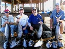 Pretty good week of fishing this week..we were able to get out 5 times and experienced some increadible yellowfin tuna fishing..I had the crew from Capital Valve and fitting a week to the day ..did alot of boat riding until we got on a bite - no fish in the boat until 2pm..it was frustrating but we never know what to expect after a week of weather cancellations..wasnt for lack of trying..but we were able to pull off the 4th quarter win and save the day with had fast action, finding 5 yellowfins on 8 bites..the largest 75 pounds..we tried to bag a jack or two early in tha day before making the run but were eaten alive by jacks and cudas..in fact we had caught 2 big sharks and several baracudas earlier in the day while tuna fishing and just as many slimey cudas on wahoo baits.. Crew consisted of..Savoie, Boudreaux. Gravouia (there's got to be "T" on the end., Rogers (Reaujeure), and Thibodeaux..Acadiana represent!