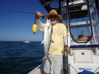 Finally we made it to section of hard pan bottom in 20' for some Mackerel action. Casting live white baits on 2/0 long shank hooks without any weights worked over and over. When the action slowed I would toss live chum baits and get the action started again. No Kingfish this trip but look for the big push of migrating Kings to show up anytime.