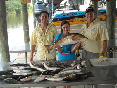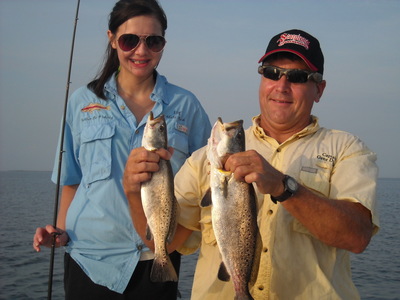 Had the day off so I took the family out for some fishing My wife Angela,Jacob,Sarah. Hit the water early got right on some nice trout too. Sarh was on fire she was putting them in the boat steady. Angela and Jacob were right on too and ai was pretty busy with the net for awhile. Jacob had big fish of the day and drag pulling redfish. We headed in before it got hot with all we needed. The trout fishing has realyy turned on this past week.