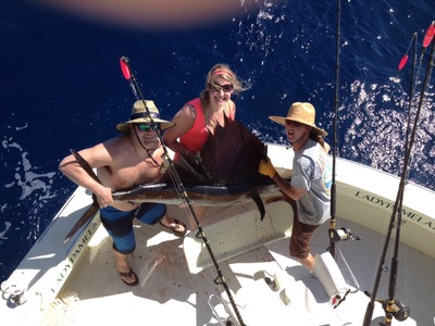 There is one great thing about women anglers, they listen and do what they're told. They don't try to overpower the fish, they use finesse and let the rod and reel do their work. It took all of about 20 minutes or so to get the fish at the side of the boat and Justin reached over, grabbed him by the bill and brought him in for pictures. I mean who wouldn't enjoy seeing a pretty blonde next to her first sailfish?