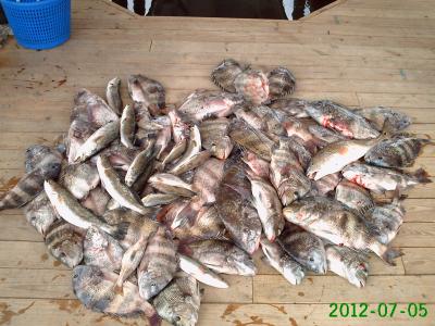 Fast action and drags screaming on the Beach Friday. I picked up Joe Maniscalco, Johnny Fitzpatrick, and Stuart Des Roches bright and early Friday morning at Campo's. The wind was calm and the water flat as we headed down the MRGO out into the Sound. Our first stop was a small wellhead were the guys Caught and released lots of big Reds and Drum. They also put a few Sheepshead, Drum, and Channel Mullets in the box. Our next stop was at another well further out and right from the start the action fast and the Heads were huge. It was a blast to watch the guys cast dead shrimp on a jig head to the rig, count to 3 and bam it was CUI Custom Rods bent and Okuma reels screaming. I could hardly keep up with netting the fish. Finally they could not take anymore. Good thing because I think we could have sunk the boat with those big hungry Heads. We then made a move a little closer in and worked on getting some Trout. We did manage to pick up 12 pretty 16"-20" Trout to top off an overfilled fish box. They had a great time and sore arms along with a lot of meat to feast on. Total for the day was 52 Sheepshead, 12 Trout, 6 Drum, 1 Red, and 12 Channels.