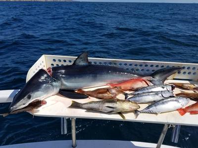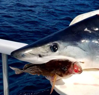 Captain John at the helm and first mate Hale on the back deck for a ¾ Day Local Trip. It was a beautiful day on the water couldn't ask for better weather. They started out trolling for yellows but no luck but they managed a 1 mako and lost 3. One of the mako’s came out of the water and gave everyone a show but came unbuttoned while dancing. They ended up with 7 various rockfish and 1 smaller grade mako.