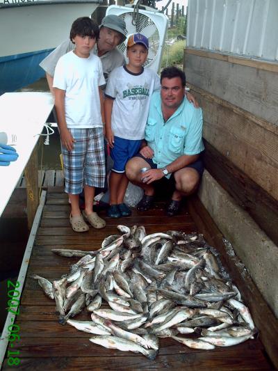Father and son fun on the Beach today. Today I had the pleasure of fishing with Tim Fitzpatrick, his sons Jake and Kyle, and his father in law Dick. We were greeted by a stiff SE wind this morning as we pulled out of Campo's with a well full of their world famous live shrimp. With the wind blowing pretty good and rain showers building we stayed close in Bay Eloi. On our second rig the guys got on a good bite and were putting Trout in the boat at a good pace. The Trout were on the small side, but with the conditions and not a lot of throw backs no way was I going to leave. But leave we did, the rain was coming on us so we headed in a clear direction and got behind the storm were we continued fishing till the box was full and there was a break in the storms. We managed to stay dry for the most part till we got back in. Total catch for the day was 100 Trout, 30 Channel Mullets, and 1 Flounder. They did a great job of fishing today in some not so good conditions, and a pleasure to be with.