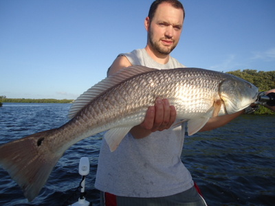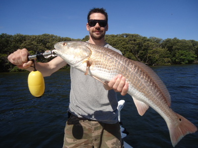Next up Dad (Pete) got in the action with a true brute. Pete was having a blast with his first ever redfish as the red made run after run. This was a very big fish and was giving Pete all he could handle but Pete out witted this beauty getting the fish out of the mangroves and into the open\. It was very clear this was truly a beautiful fish. Pete proudly posed for a quick picture with his 32" redfish. Pete Travis and Cody are from NY and Boston and were truly amazed by the power of redfish. They typically catch smallmouth bass, pike and northerns and are now hooked on redfish.