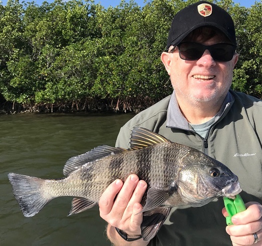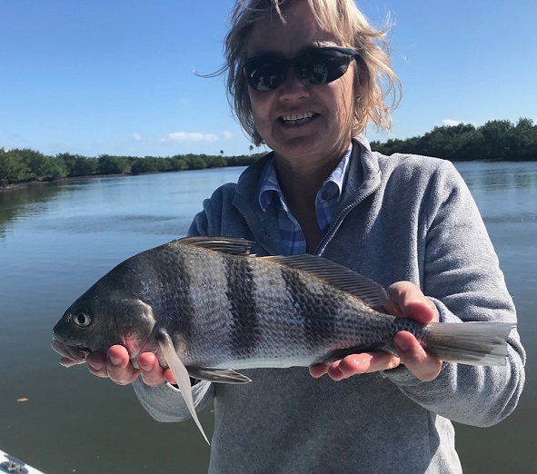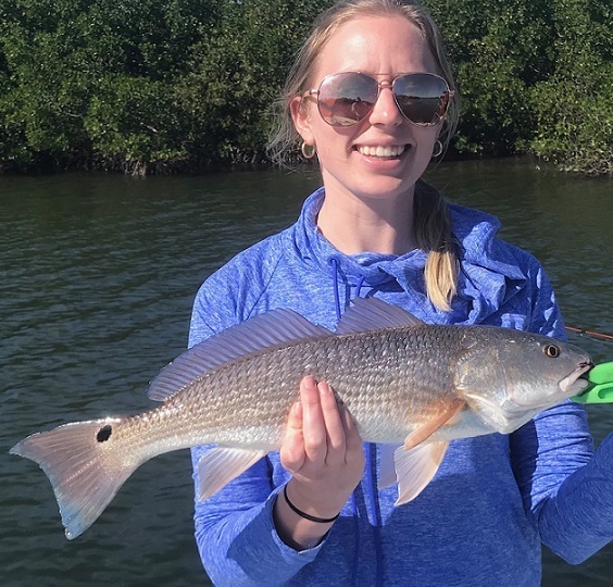 Water temperatures have ranged from the mid 50’s to the upper 60’s as we have had a chilly week then a warm week through the winter, colder water schools up the fish while mild temps spread out the fish. Winter fish like Sheepshead and Bluefish are usually every trip catches here in the backcountry, and year around fish also, Redfish, Snook, Seatrout, Black Drum, Mangrove Snapper, and more. During the warmer weeks we see signs of early spring, tiny schools of tiny newly hatched fish hiding around the Mangrove roots, and a few spring fish biting like Spanish Mackerel, Jacks and Ladyfish. Water level is down low as is normal by late winter with prevailing north and west winds after the cold fronts and the dry season we are in now. A good recent trip with lots of variety and repeat clients from Indiana had a few good Trout, Black Drum and the best Redfish caught by Courtney ……………