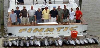 This report com,es from Eric Capetta et al who went out on the Finattic last week with Capt Scot Leger and Buddy.. Hey Scott...well I'm sure Leger told you that we banged up the Tuna pretty good...It was outrageous!! Leger showed up ANGRY at the tuna...like he hadn't caught one in a month! The first night bite was a little slack on the yellows, but we caught blackfin and bonita until nobody could stay awake any longer. Leger and I stayed up and caught flying fish off the back of the boat in the lights...then the next morning the yellowfin turned on and we were doubled up from 5:45 A.M until 1:00 that afternoon straight! Uncle Tony even put a whipping on a tuna!! The bite let off a little bit at 1:00 but we were still putting tuna in the boat. Our boat limit was 27 tuna, and at 5:00 P.M with 23 tuna in the box, Uncle Tony said "Let's head for the snapper hole" I butchered and packaged well over 1000 pounds of tuna yesterday. We also had Dolphin, Snapper, Amberjack, tilefish, and a lone grouper. The second picture attached has Leger on the far right. I'll be in touch later in the week about the Grand Isle trip / weather. We are ready to go (although I personally am still pretty freaking sore!) Hope all is well with you,