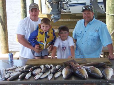 Well the wind was back on today. Jimmy and nick brought their sons Brett and Jacob down today to do some family fishing. Well Jacob age five his first fishing trip at the first stop caught the first fish his first Speckled trout YAHOO! That boy is hooked for life. Well we got a few trout in a few places where we could get out the wind but nothing steady. Last stop was the icing on the cake Reds and Drums and the drags were screaming and so where the boys. Brett and Jacob landed their first redfish each. Along with some black drum. A great day despite the wind, Kids fishing and having fun with their dad's.
