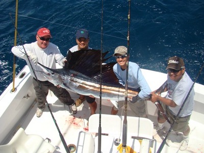 The sail came back for one more swipe at our bait. This time we got him and we were Hooked Up. Squeaky jumped in the chair and the fight was on. At first this fish was dancing all over the surface of the ocean but then he went down and it seemed to take Squeaky for ever to turn this fish around. But after a good 30 min he finally got his sail to the side of the boat. It turned out that it had taken so long to reel his fish in because he was hooked in the side.