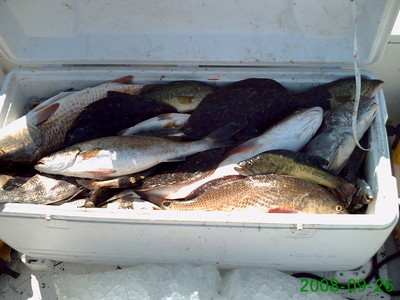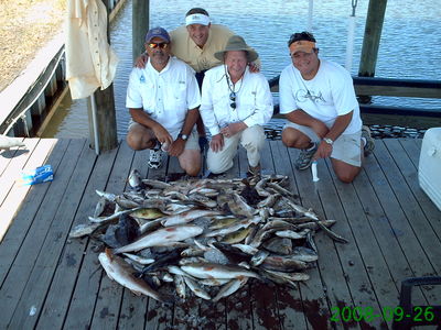 Fish kill Friday on the Beach. Friday was one of those days that the fish did not stand a chance. Onboard were Tony, Chris, Dan, and Dan. I picked them up at their friend's camp in Fort Beauregard then we stopped by Campo's for bait. The wind was blowing a little and the tide was rising. We started off fishing is a bayou behind Hopedale with live shrimp on a Carolina rig and the Trout ate it up. The Trout were good sized and there were some White Trout mixed in along with some Drum and Heads. The trick was to keep the bait moving. As the tide got stronger the bite slowed as we were close to our limits, but the guys figured them out. With Trout done we made a close move to the shoreline to look for some Reds. Fishing with live shrimp under a cork the guys put some nice Reds, Drum, Flounder, and Bass into the boat. With no more room in the fish box we headed on in. Lots of fish and lots of fun. Total for the day was 125 Trout, 30 Whites, 7 Reds, 10 Drum, 8 Sheepshead, 4 Flounder, and 4 Bass.