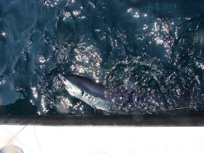 Within 20 min we had a Nice mako in the slick est some where between 180-220lbs. He short bit a bluefish fillet twice? why he didnt just gobble it up anyones guess? He then came by the swam by the boat and left...