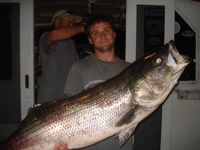 Headed out to deeper water found a spot with some good marks and scattered bait... Phil Sr. started us of with a nice fish 35lbs... Phil Jr.followed with the same 33lbs ... Missed a couple on that drift too...