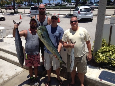 As the warmer weather comes to south Florida we almost always begin by trolling some rigged baits. Kingfish, Bonito and more are usually available with this kind of fishing. That's what we expect. And today's group got just that, a quick bite from a small Kingfish. Russell easily handled this fish to the boat as we began to search for more. But more were not to be found. A school of one?
