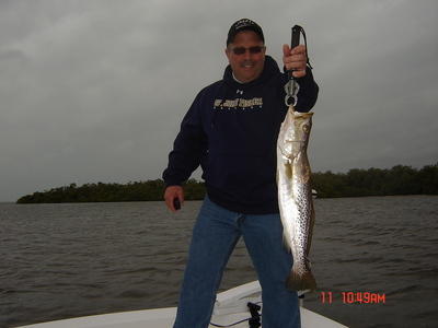 Tuesday on a overcast day fishing with Bill Krein we were able to catch some nice slot trout casting mirrolures around oysterbars in San Carlos Bay. We were also able to catch a good number of schooling size trout and a few slot fish casting white redfish magic in 3-6 ft. of water with a patchy grass bottom.