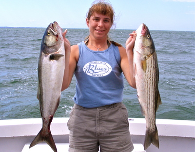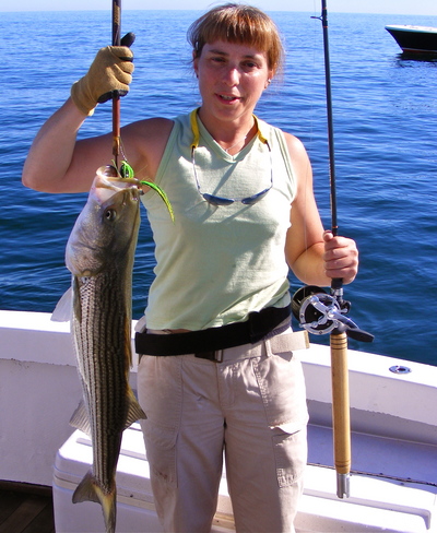 One other area that seems to become fairly active in the later part of the season, late August and through September, is the West Bar of Barnstable Harbor. This area can produce some really big stripers. This year some of the fish have weighed in at 45 to 47 pounds. That is a big fish. On the 6th of September Anne MacDonald and I fished this area during the flood tide. It only took us 30 to 40 minutes to land 4 keepers all over 34 inches. We released the fish under that size. After getting our limit Anne used my light jigging set up and we landed more good size keeper which were released also.