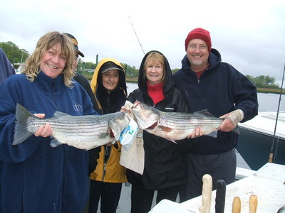 we had gary and bill along with john, cathy, kelly and dawn out this day fishing for bass, cathy and kelly had 1 nice keeper bass each the largest at 34 inches, gary caught the first blue fish, and dawn landed a 21 inch fluke on a clam bait while the boat was at anchor, a good group of anglers who had a good time of fishing, capt Joe.