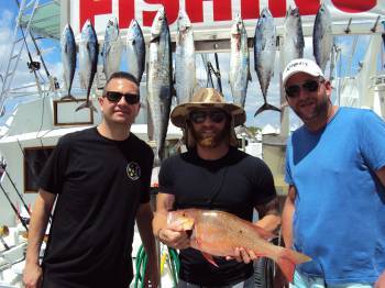We started out trolling with two #8 plainers down, one with a blue and white sea witch and the other with a pink and blue sea witch, both with double hooked Bonito strips. For surface baits, we went with two Ballyhoos and two Bonito strips. As we trolled the reefs, zig zagging in and out between 80 ft. of water out to 200 ft., the anglers took turns reeling in their catches - four Kingfish and 10 Bonitos.