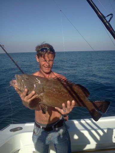 I crissed-crossed the reefs and fished over the artificial wrecks as I worked to the north of Fort Lauderdale catching Bonitos, Black Fin Tunas and a couple of Kingfish. From there I headed towards the artificial wreck known as the Marriott airplane artificial wreck which is a double propped cargo plane which was sunk in 1991 in 72 ft. of water. As I approached the airplane, I slowed the speed of the Happy Day Today to let the baits sink down deeper. On my third pass, the plainer rod bent over – I knew it would be a Grouper. Jessica was our angler and reeled in a Red Grouper. I continued to fish over the wreck, and on our second pass the plainer rod bent over. At first I thought we were hooked on the airplane as the line went off the reel at a good speed; then the line stopped peeling off the reel and our angler, Mr. Backman, kept retrieving the line. 500 ft. behind the boat the Grouper popped up to the surface and Mr. Backman reeled in the Black Grouper.